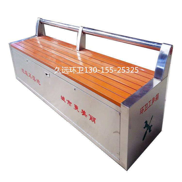 環衛工具箱:也叫保潔員工具箱,環衛工具椅,保潔員休息座椅,市政保潔箱等。工具箱常用尺寸為:長2400*寬500*高550mm,也可以做成2米,2.4米,2.7米等,寬度和高度也可以定做,滿足不同客戶、不同場所的使用要求。